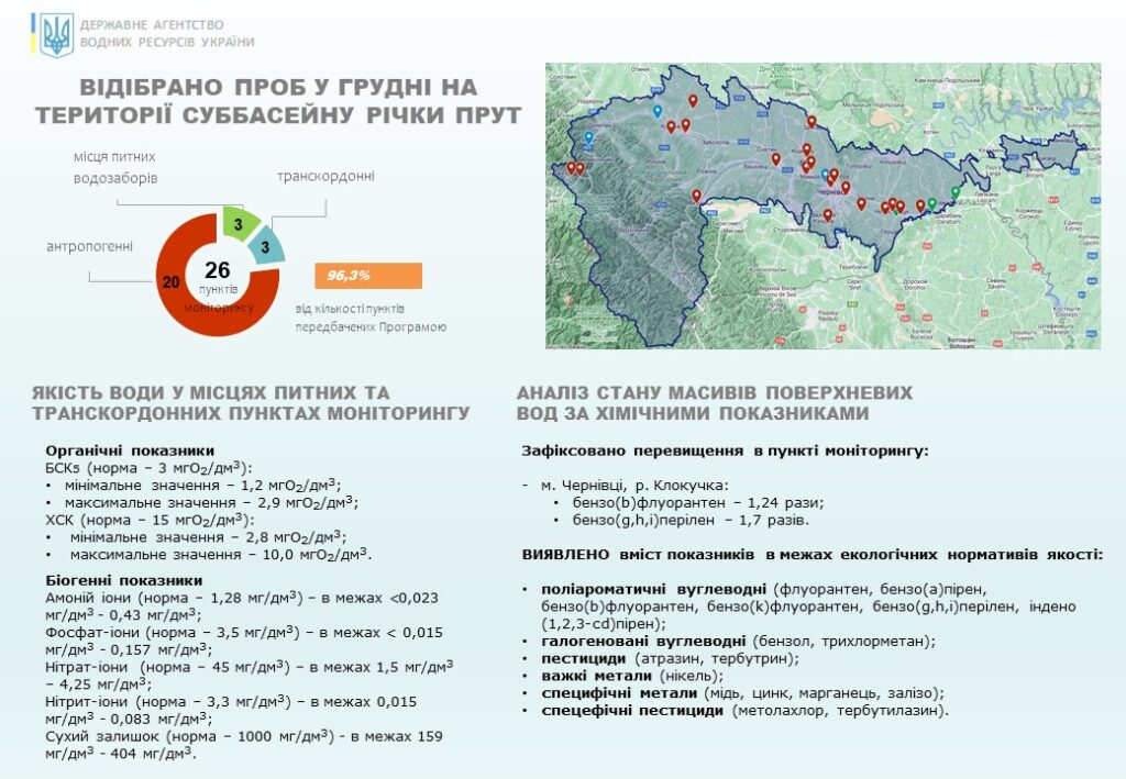 Для встановлення стану масивів поверхневих вод в суббасейнах річок Пруту та Сірету Басейновою лабораторією моніторингу вод БУВР Пруту та Сірету, а також лабораторією моніторингу вод Західного регіону Дністровського БУВР відповідно до Програми державного моніторингу вод впродовж грудня відібрано 32 проби та проведено 1480 вимірювань вмісту пріоритетних специфічних забруднюючих речовин та