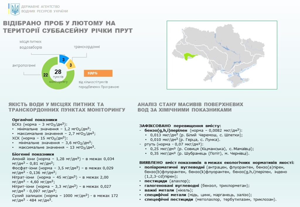 Якісний стан водних об’єктів річкового басейну Прут та Сірет в лютому 2026 року. Для встановлення стану масивів поверхневих вод в суббасейнах річок Прут та Сірет Басейновою лабораторією моніторингу вод БУВР Пруту та Сірету, а також лабораторією моніторингу вод Західного регіону Дністровського БУВР відповідно до Програми державного моніторингу вод впродовж лютого