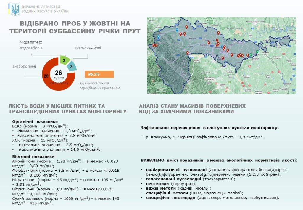 Для встановлення стану масивів поверхневих вод в суббасейнах річок Пруту та Сірету Басейновою лабораторією моніторингу вод БУВР Пруту та Сірету, а також лабораторією моніторингу вод Західного регіону Дністровського БУВР відповідно до Програми державного моніторингу вод впродовж жовтня відібрано 32 проби та проведено 1480 вимірювань вмісту пріоритетних специфічних забруднюючих речовин та