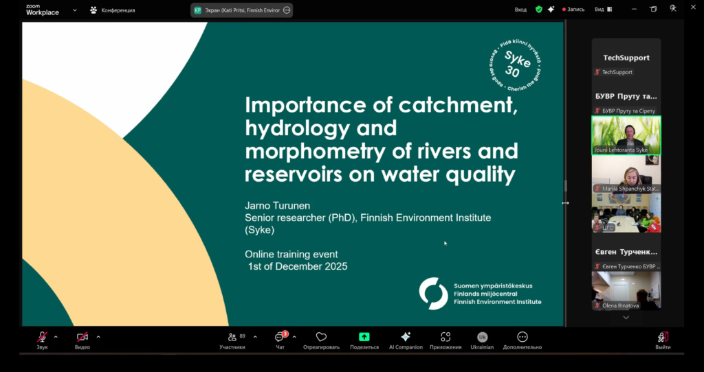 Фахівці Басейнового управління водних ресурсів річок Пруту та Сірету взяли участь в онлайн-тренінгу «Як планувати програму моніторингу відповідно до Водної Рамкової Директиви», який відбувся 1 грудня 2025 року в межах реалізації міжнародного українсько-фінського проєкту «Підтримка України в оцінці шкоди довкіллю та розвитку моніторингу якості поверхневих вод і біорізноманіття». Проєкт реалізується