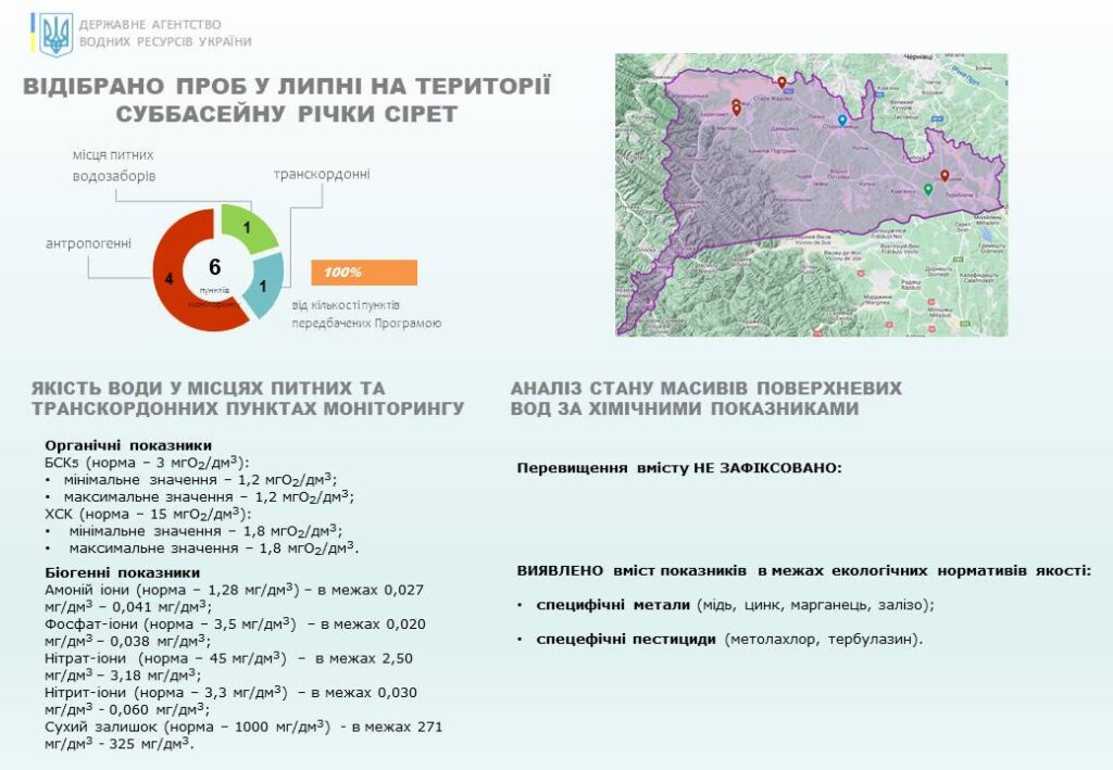 Для встановлення стану масивів поверхневих вод в суббасейнах річок Пруту та Сірету Басейновою лабораторією моніторингу вод БУВР Пруту та Сірету, а також лабораторією моніторингу вод Західного регіону Дністровського БУВР відповідно до Програми державного моніторингу вод впродовж липня відібрано 32 проби та проведено 1480 вимірювань вмісту пріоритетних специфічних забруднюючих речовин та