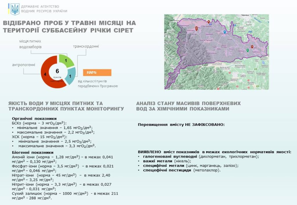 Для встановлення стану масивів поверхневих вод в суббасейнах річок Пруту та Сірету Басейновою лабораторією моніторингу вод БУВР Пруту та Сірету, а також лабораторією моніторингу вод Західного регіону Дністровського БУВР відповідно до Програми державного моніторингу вод впродовж травня відібрано 32 проби та проведено 1480 вимірювань вмісту пріоритетних специфічних забруднюючих речовин та