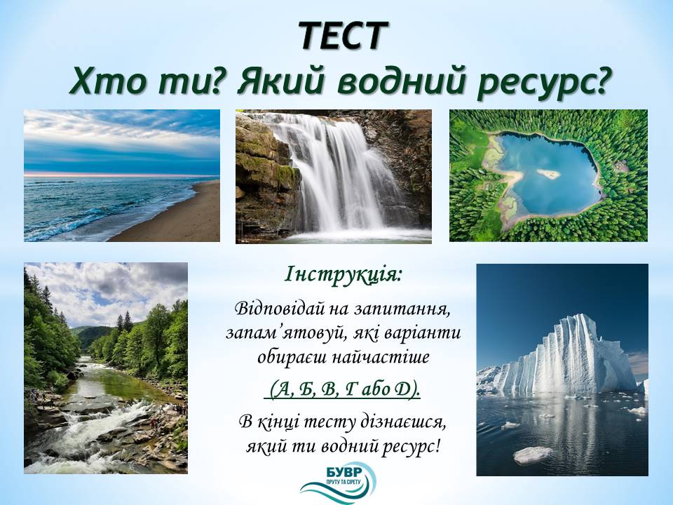Напередодні відзначення Всесвітнього дня води пропонуємо вам пройти цікавий тест! Вода – це життя, і кожен її ресурс має свій унікальний характер. А який з них схожий на вас? Басейнове