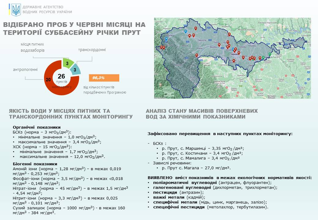 Для встановлення стану масивів поверхневих вод в суббасейнах річок Пруту та Сірету Басейновою лабораторією моніторингу вод БУВР Пруту та Сірету, а також лабораторією моніторингу вод Західного регіону Дністровського БУВР відповідно до Програми державного моніторингу вод впродовж червня відібрано 32 проби та проведено 1480 вимірювань вмісту пріоритетних специфічних забруднюючих речовин та хімічних і фізико-хімічних показників якості вод.