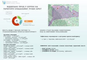 Для встановлення стану масивів поверхневих вод в суббасейнах річок Пруту та Сірету басейновою лабораторією моніторингу вод БУВР Пруту та Сірету, а також лабораторією моніторингу вод Західного регіону Дністровського БУВР відповідно до Програми державного моніторингу вод впродовж серпня відібрано 32 проби та проведено 1480 вимірювань вмісту пріоритетних специфічних забруднюючих речовин та хімічних і фізико-хімічних показників якості вод.