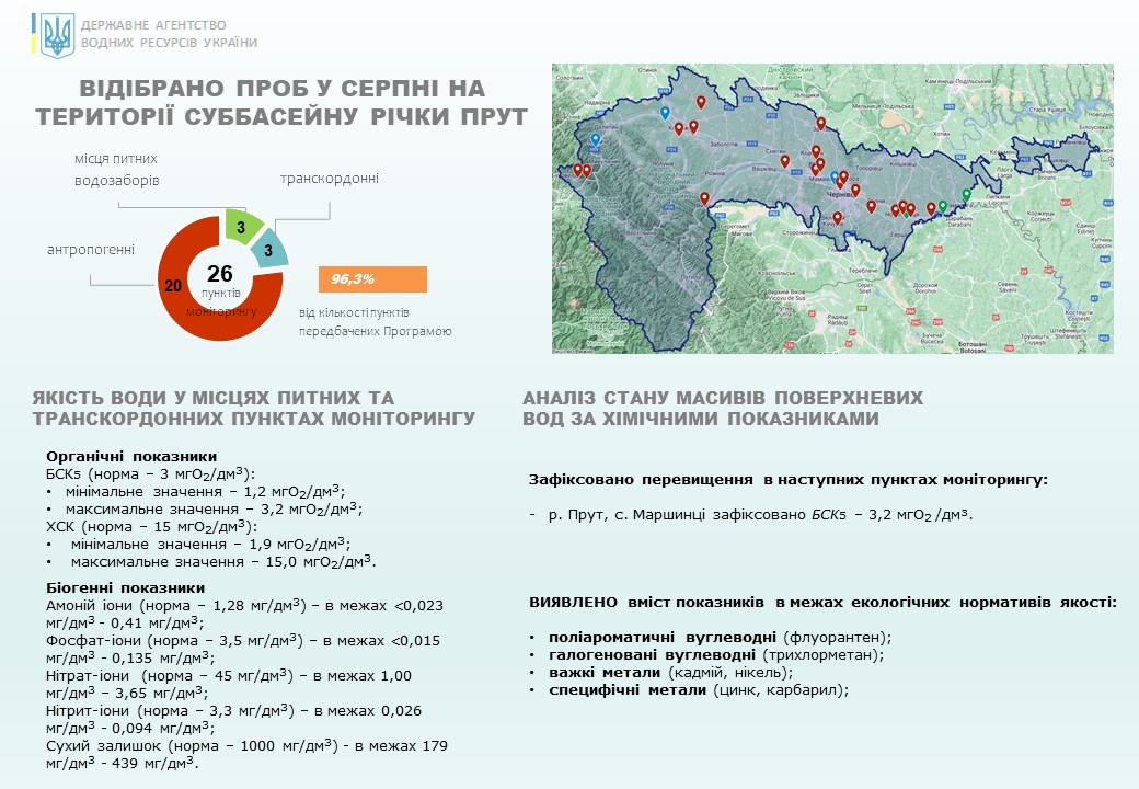 Для встановлення стану масивів поверхневих вод в суббасейнах річок Пруту та Сірету басейновою лабораторією моніторингу вод БУВР Пруту та Сірету, а також лабораторією моніторингу вод Західного регіону Дністровського БУВР відповідно до Програми державного моніторингу вод впродовж серпня відібрано 32 проби та проведено 1480 вимірювань вмісту пріоритетних специфічних забруднюючих речовин та хімічних і фізико-хімічних показників якості вод.
