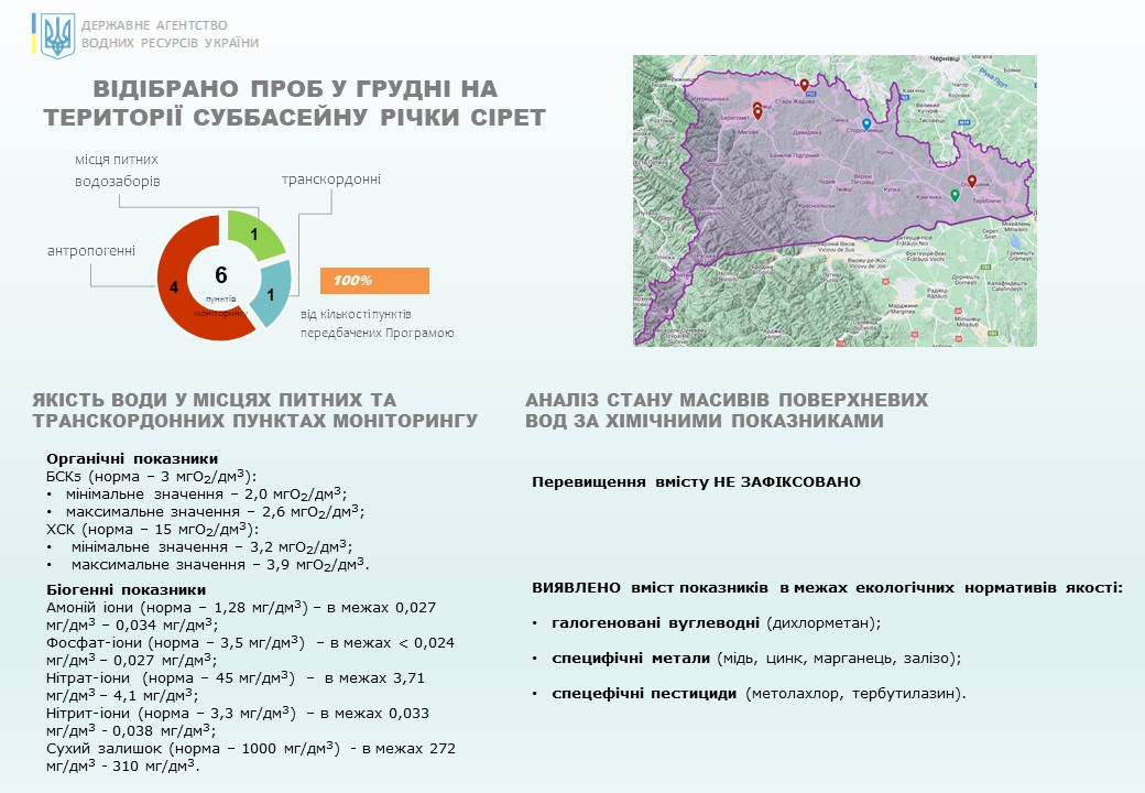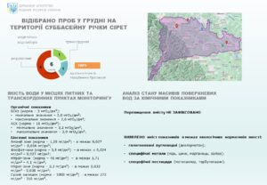 Для встановлення стану масивів поверхневих вод в суббасейнах річок Пруту та Сірету Басейновою лабораторією моніторингу вод БУВР Пруту та Сірету, а також лабораторією моніторингу вод Західного регіону Дністровського БУВР відповідно до Програми державного моніторингу вод впродовж грудня відібрано 32 проби та проведено 1480 вимірювань вмісту пріоритетних специфічних забруднюючих речовин та хімічних і фізико-хімічних показників якості вод.