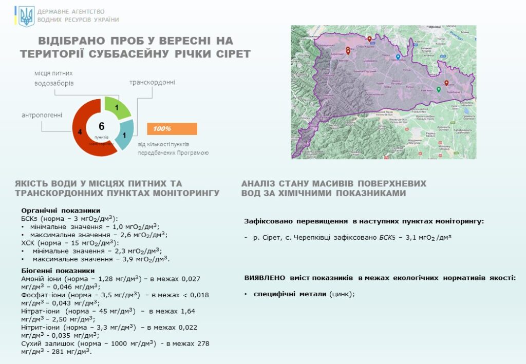 Для встановлення стану масивів поверхневих вод в суббасейнах річок Пруту та Сірету Басейновою лабораторією моніторингу вод БУВР Пруту та Сірету, а також лабораторією моніторингу вод Західного регіону Дністровського БУВР відповідно до Програми державного моніторингу вод впродовж вересня відібрано 32 проби та проведено 1480 вимірювань вмісту пріоритетних специфічних забруднюючих речовин та хімічних і фізико-хімічних показників якості вод.