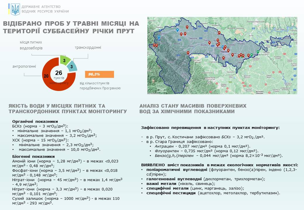 Для встановлення стану масивів поверхневих вод в суббасейнах річок Пруту та Сірету Басейновою лабораторією моніторингу вод БУВР Пруту та Сірету, а також лабораторією моніторингу вод Західного регіону Дністровського БУВР відповідно до Програми державного моніторингу вод впродовж травня відібрано 32 проби та проведено 1480 вимірювань вмісту пріоритетних специфічних забруднюючих речовин та хімічних і фізико-хімічних показників якості вод.